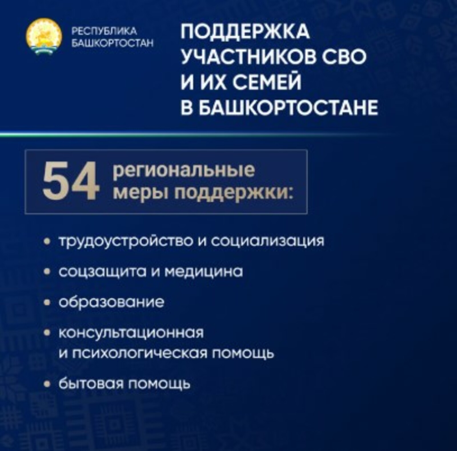 Пятьдесят четыре. Именно столько мер поддержки участников СВО и их семей действуют на сегодня в Башкирии. Об этом напомнил глава региона Радий Хабиров в своих социальных сетях.