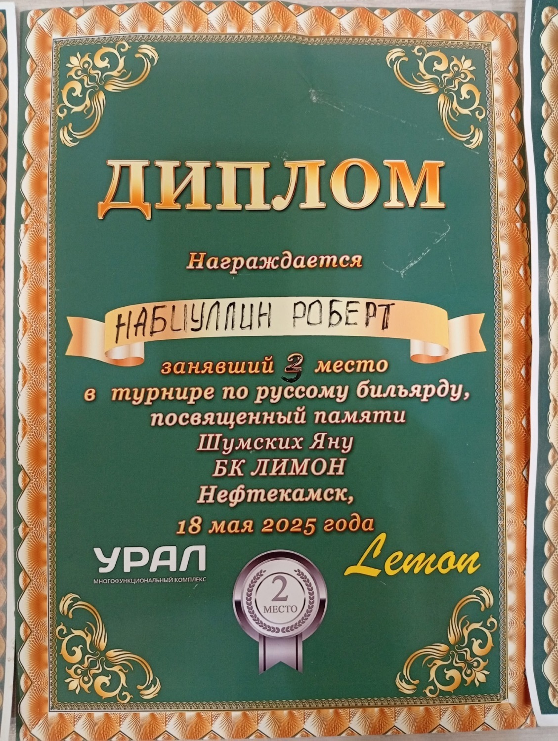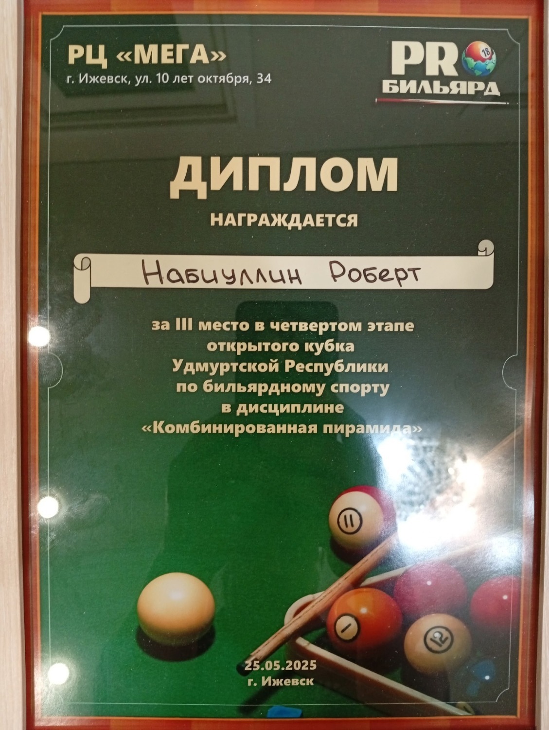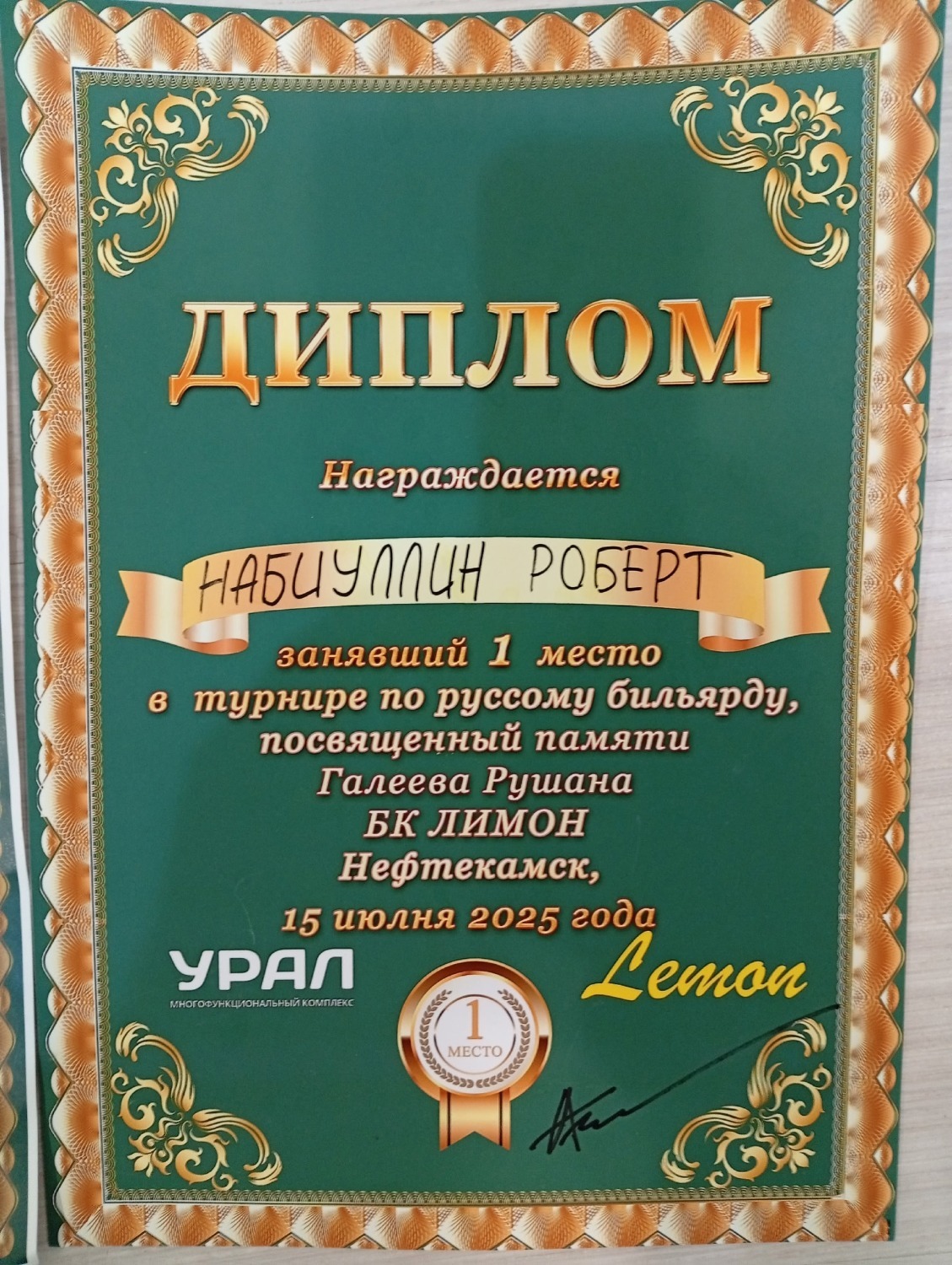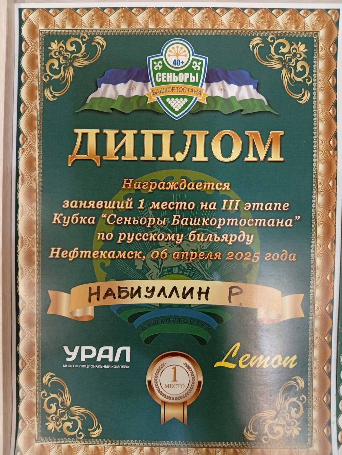 При этом одним лишь «сеньорствованием» янаулец не ограничивается. Ездил в Удмуртскую республику (3 место в 4 этапе открытого кубка УР в комбинированной пирамиде), Нефтекамск (3 место по русскому бильярду в мемориале Я. Шумских, 1 место в мемориале Р. Галеева по этому же виду).